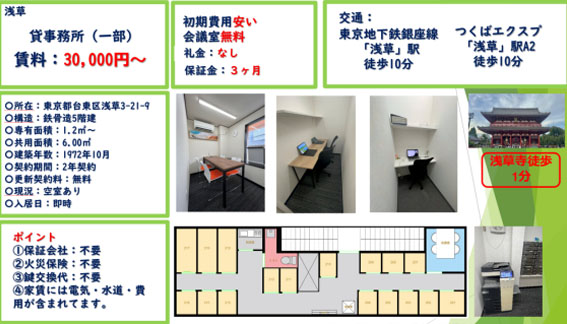 初期費用は契約手数料と保証金のみで、机と椅子、会議室、インターネットが全て無料!毎月家賃のみの支払い、もちろん水道光熱費も家賃に込み!